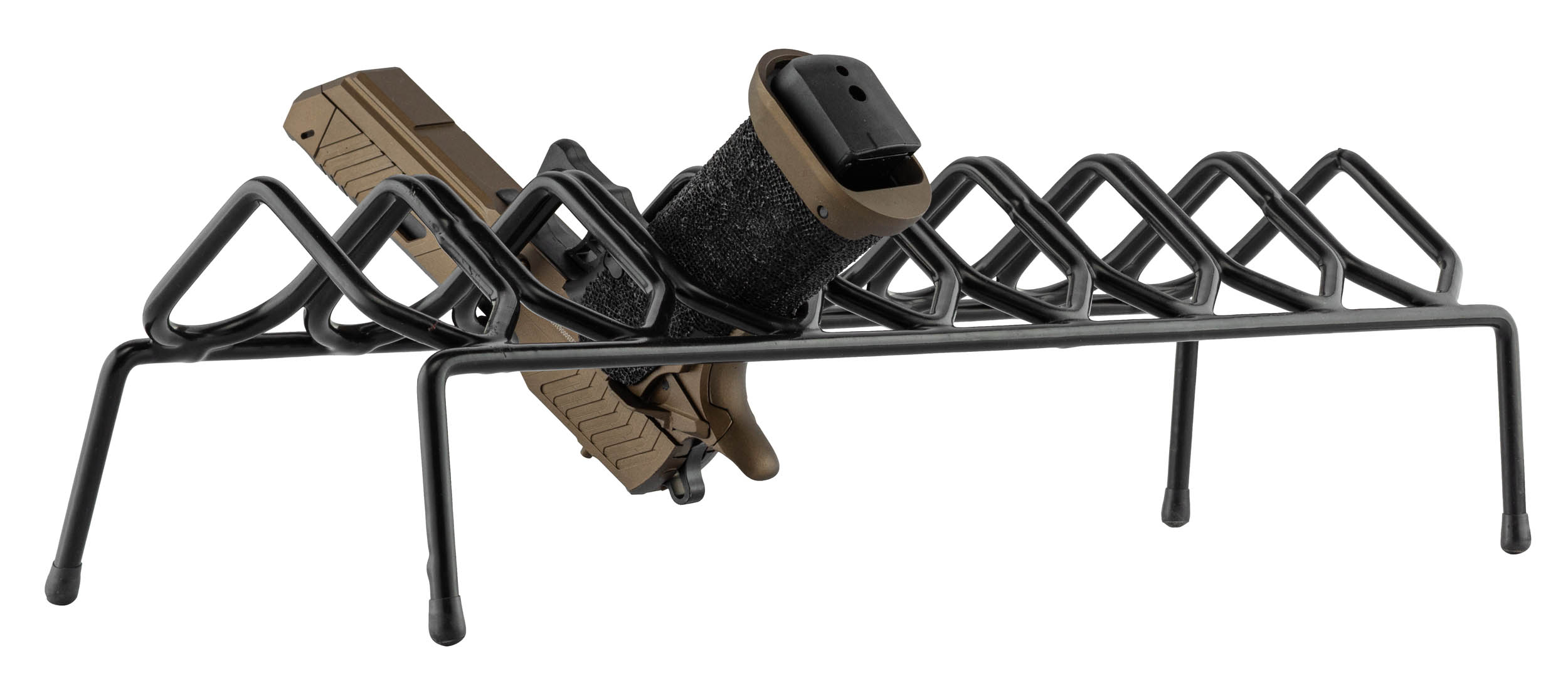 The rack maximizes storage space while providing a secure, balanced mount designed for compact pistols, full-size handguns, revolvers and semi-autos. Its PVC coating prevents scratches and marks. Store your guns upright or upside down, depending on your preference.
