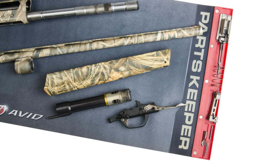 Tapis de démontage arme longue comprenant : un tapis de nettoyage rembourré de 110 cm x 40 cm et porte pièces.