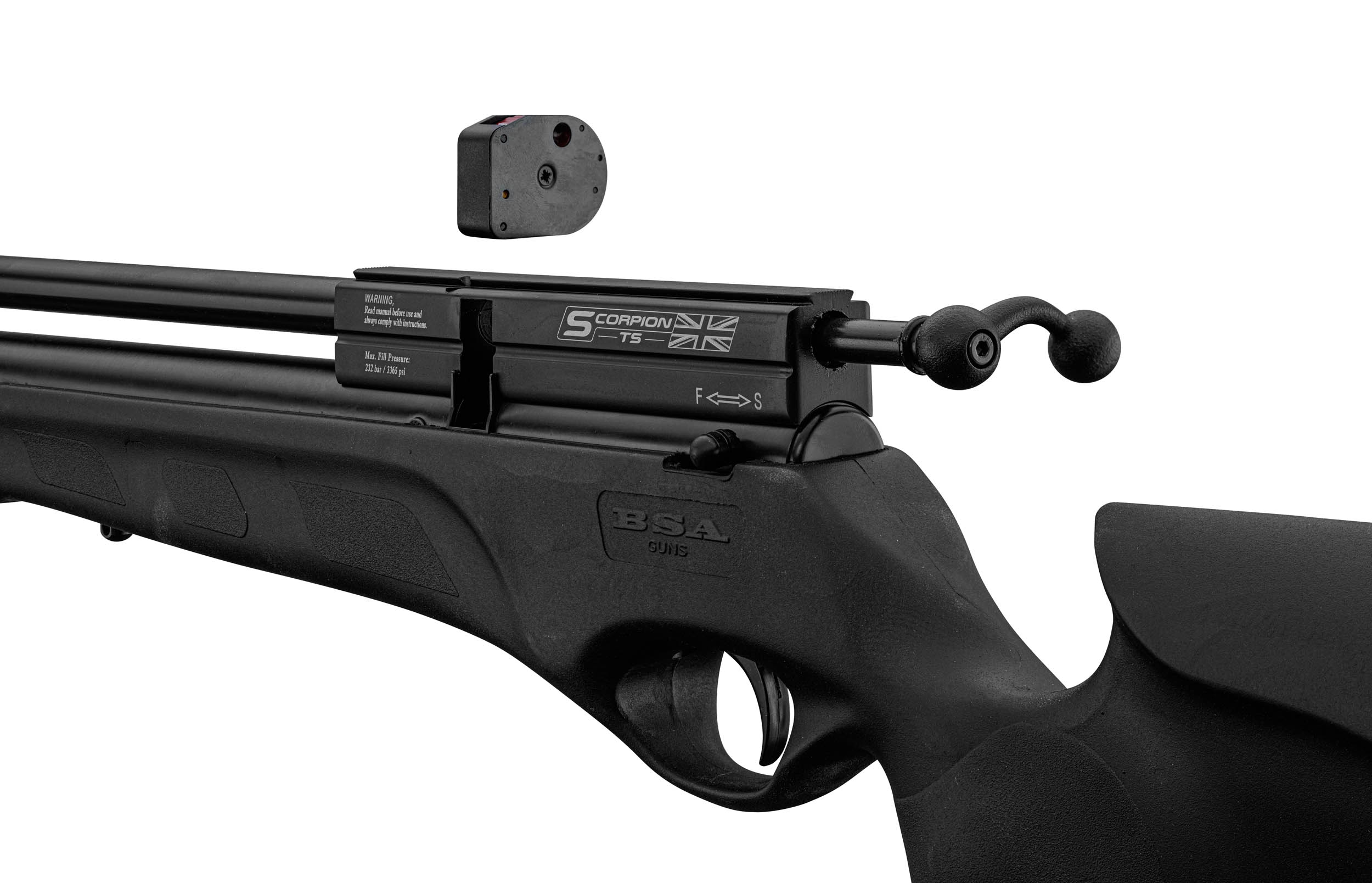 La carabine BSA Scorpion peut également être rechargée sans effort à l'aide d'une bouteille d'air comprimé (type bouteille de plongée) ou d'un compresseur électrique 230 bars.