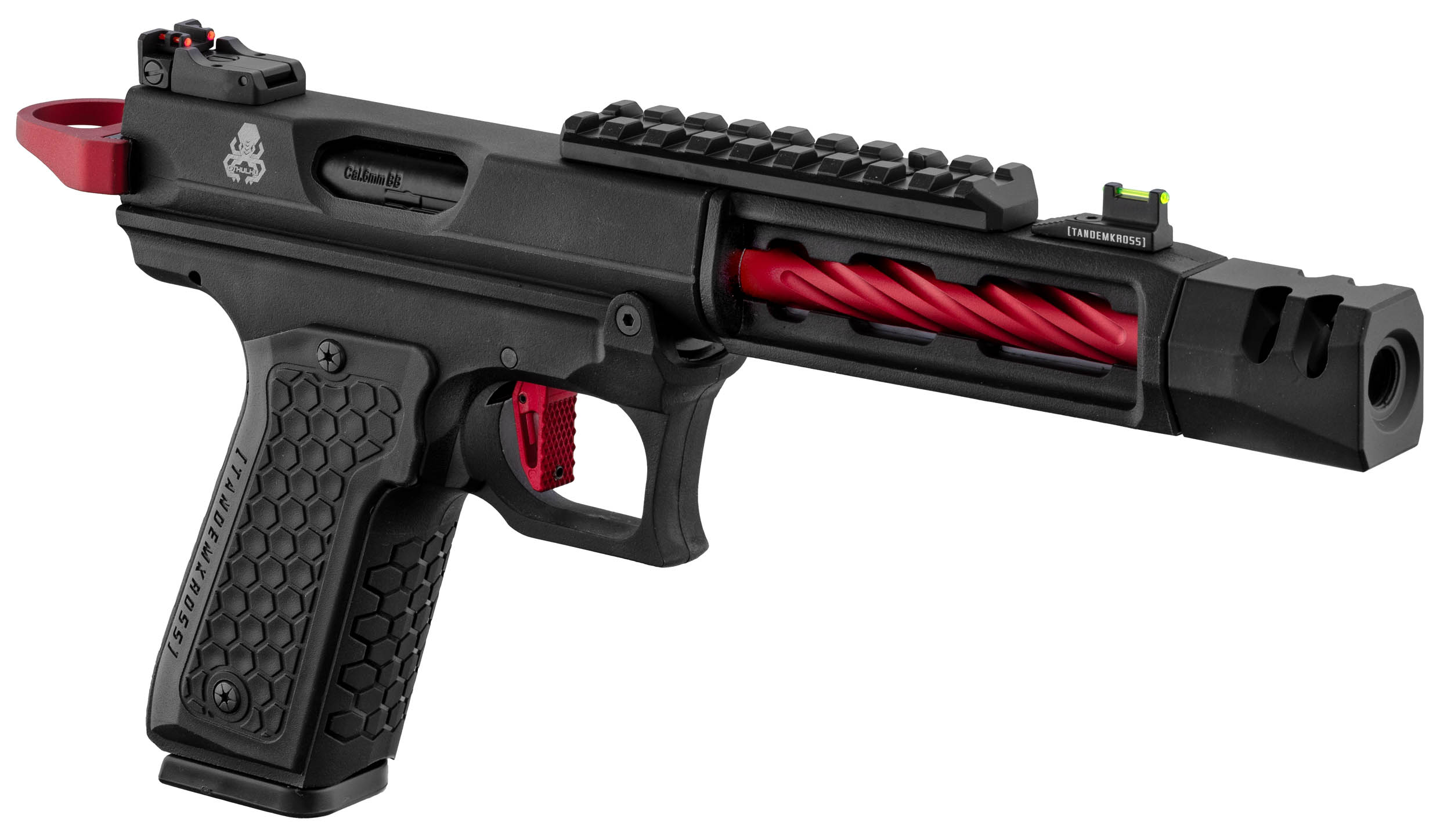 Découvrez le nouveau pistolet à gaz Tandemkross CTHULHU en noir/rouge. Fabriqué en polymère renforcé, ce GBB semi/full auto bénéficie d'un design entièrement sous licence. Cette réplique est doté d'un compensateur carré innovant "Game Changer Pro", d'un repose-pouce CNC, et d'une détente "squelette". De plus le Tandemkross Hivegrip assure une prise en main solide. Avec un anneau de chargement "Halo" et des viseurs à fibre optique "Eagle Eye", ce pistolet offre une précision inégalée. Le chargeur de 24 coups et le hop-up réglable renforce sa polyvalence.