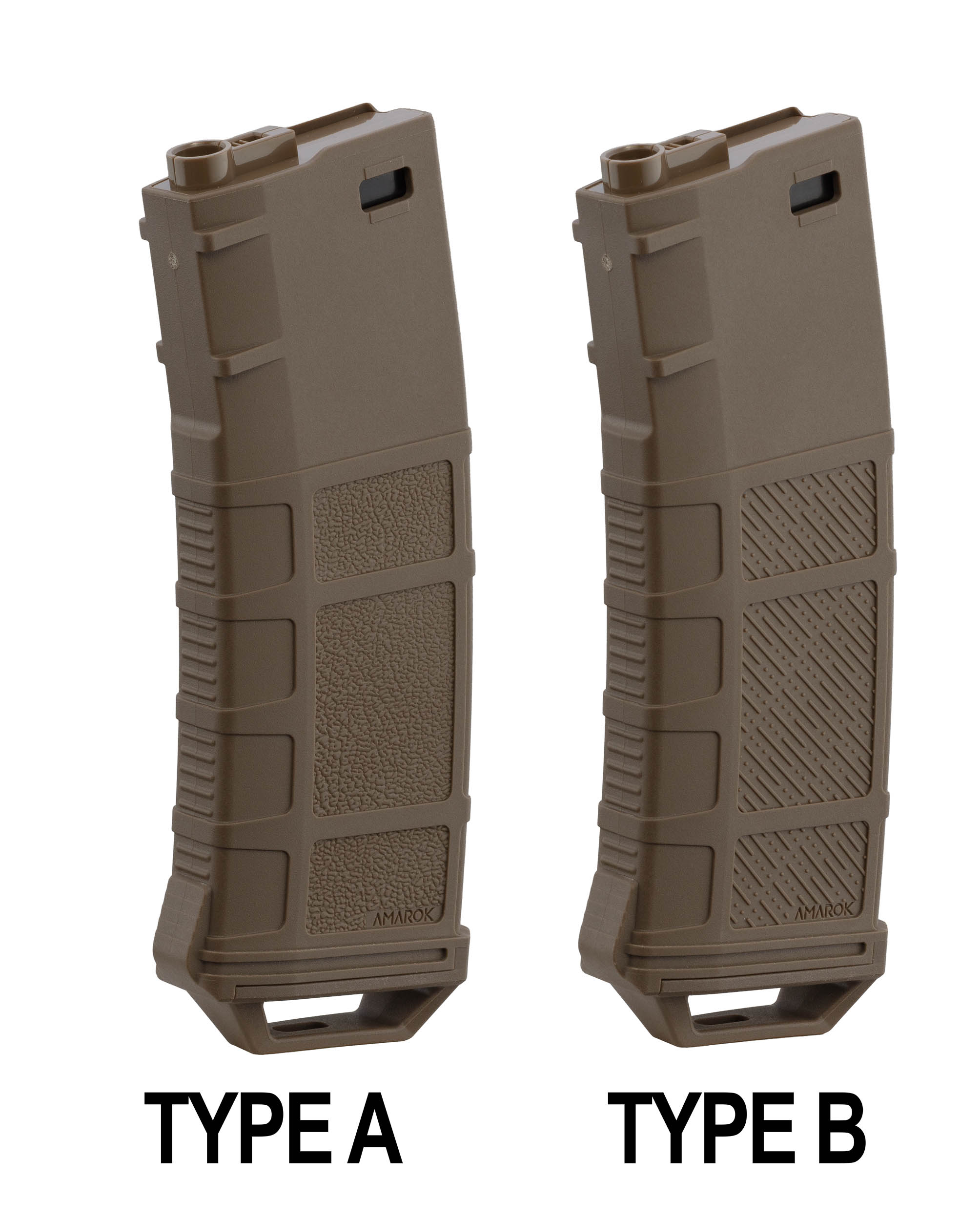 Les chargeurs Amarok se déclinent en deux versions : Type A et Type B. La différence se situe au niveau du grip. Le Type A présente une surface texturée en diagonale offrant un maintien ferme et précis, idéal pour une manipulation rapide en situation de stress. Le Type B, quant à lui, propose un grip vertical nervuré, conçu pour un dégainage intuitif et une meilleure tenue en environnement humide ou boueux. Deux styles pour s'adapter à toutes les préférences et styles de jeu.